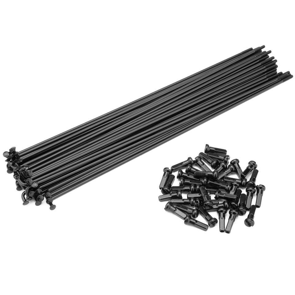 Affordable straight gauge steel spokes. Includes 40 black spokes and 40 black brass nipples. Available in various lengths.