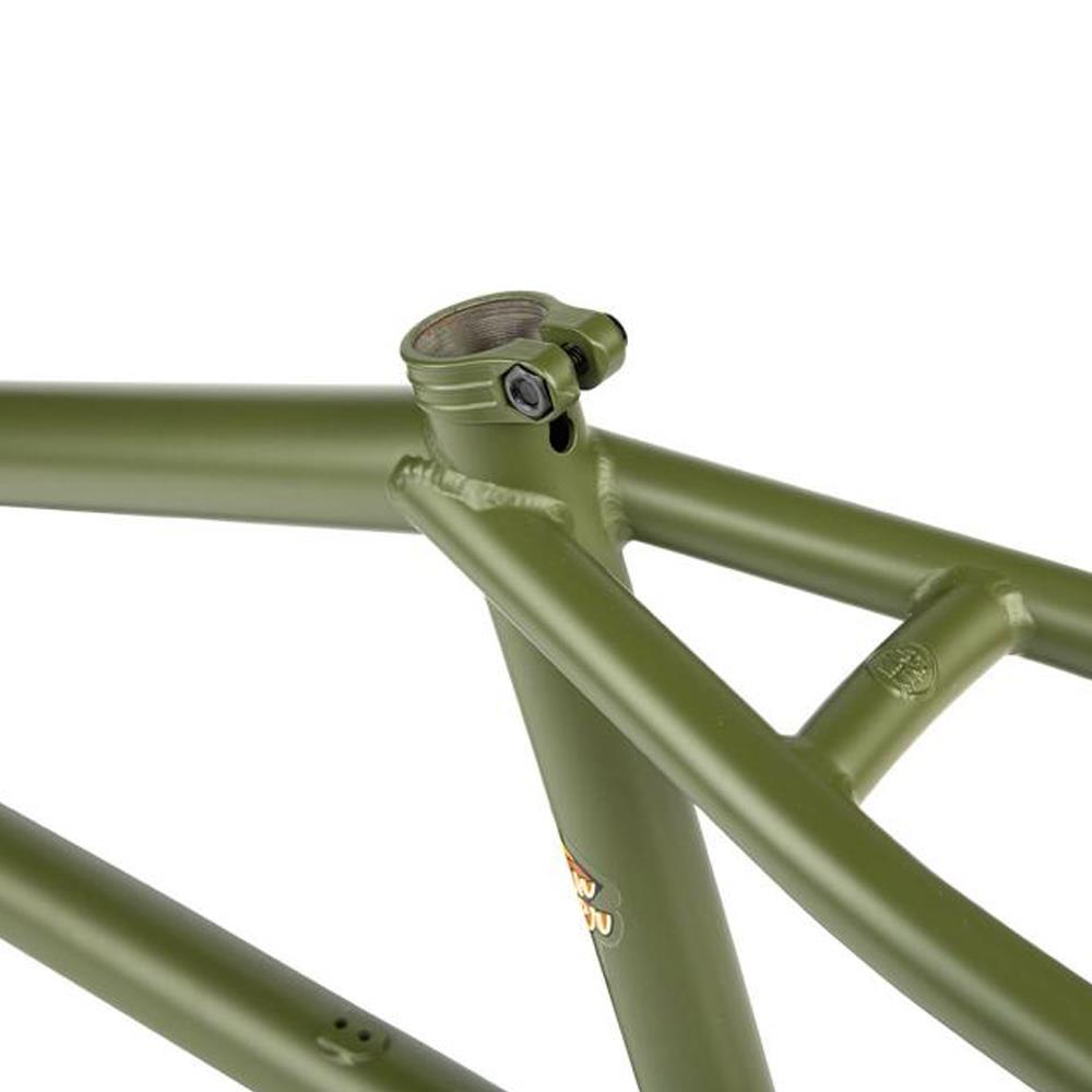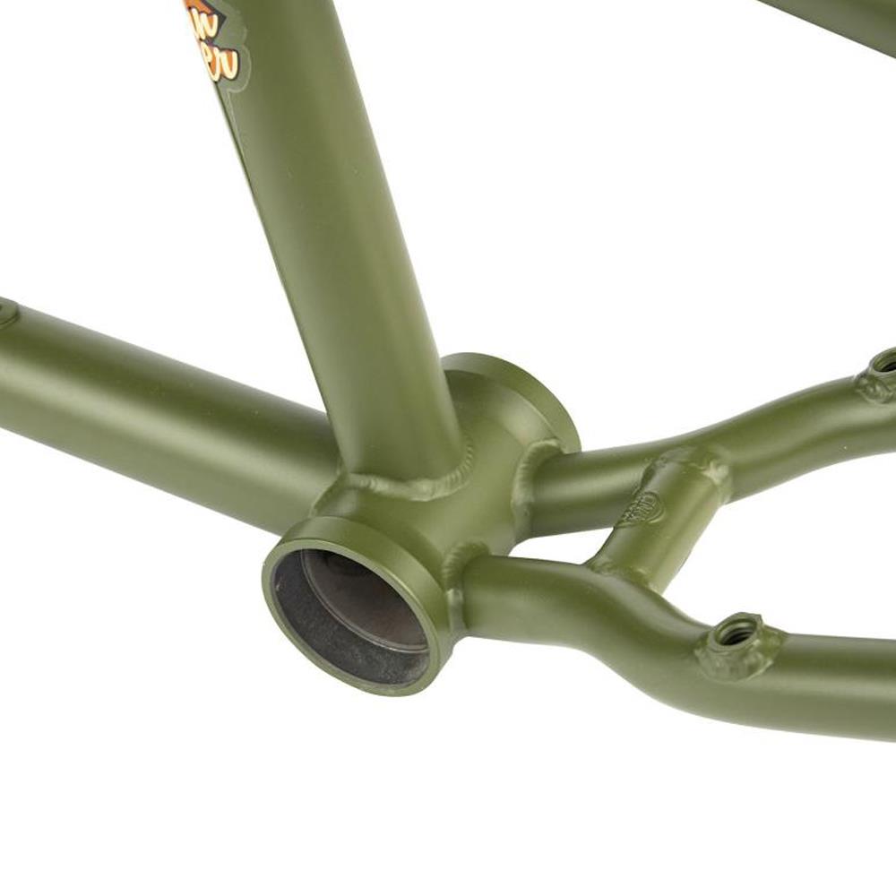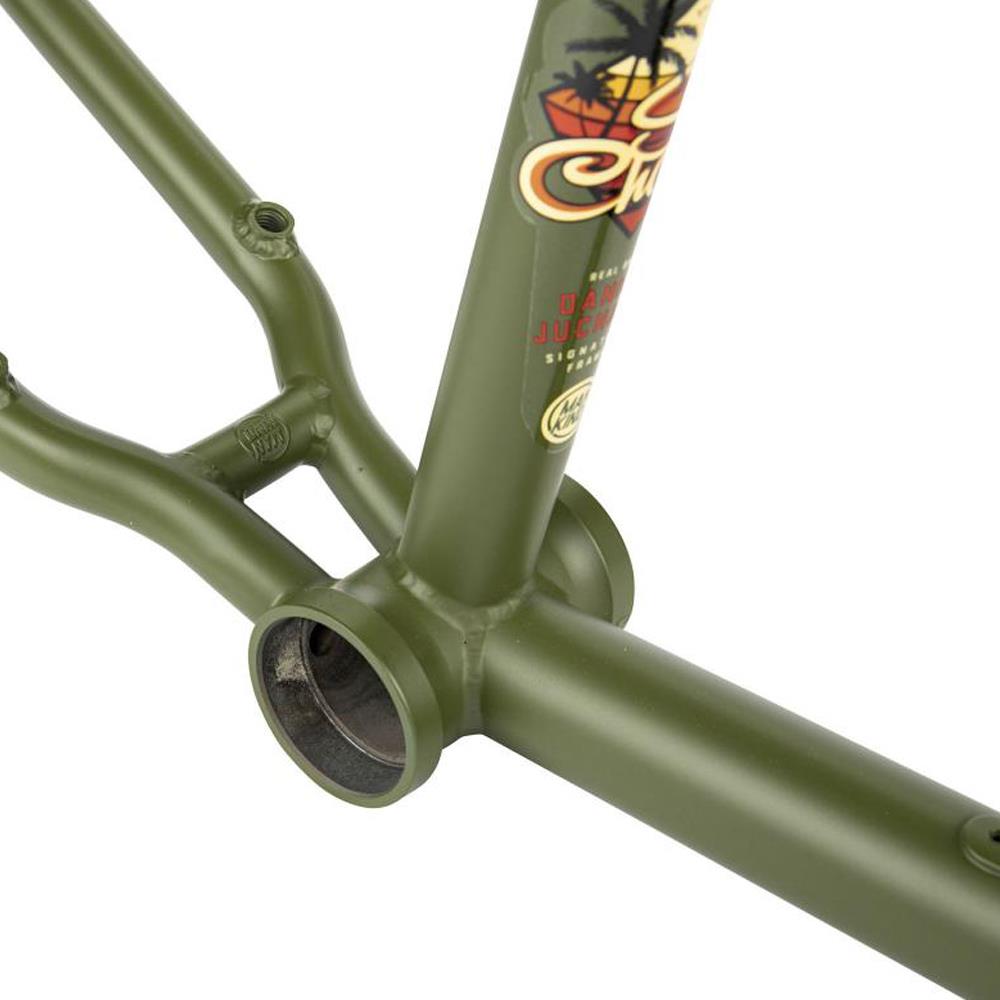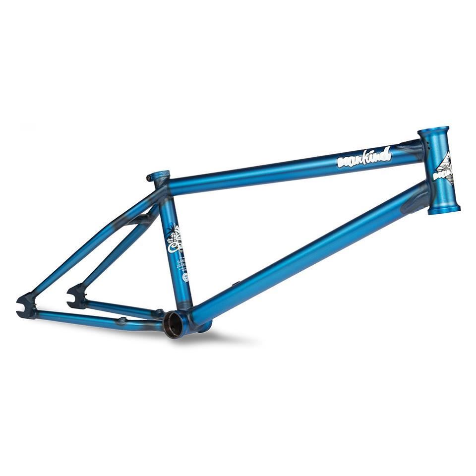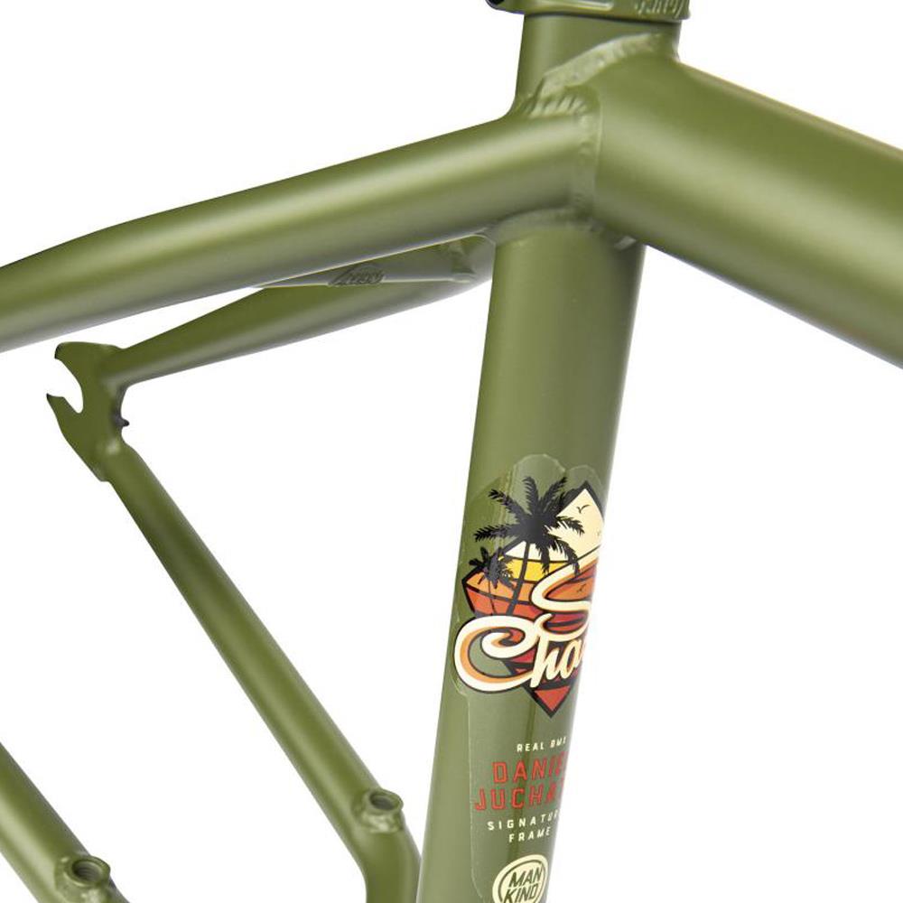 Daniel Juchatz's signature frame from Mankind, the Sunchaser! Designed for trails and bowls riding, this machine has classic mellow geometry with a 74.5° head tube angle, 11.5“ BB height and 13.75“ chain stay Length (middle of dropout) and removable U-Brake mounts (not included) on the chain stay. To complete this frame Mankind added their integrated Epoch seat clamp, Integrated chain tensioners and a Mankind down tube gusset.