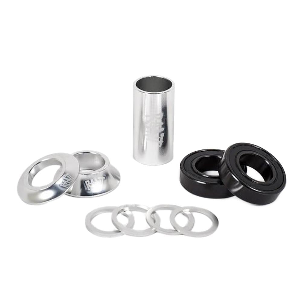 The Rant Bang Ur Mid BB kit includes 2 precision R12 sealed bearings, 2 CNC machined 6061 aluminum cone spacers for a clean look, an aluminum internal spacer, and 4 steel crank arm spacers for dialing in your chain alignment.