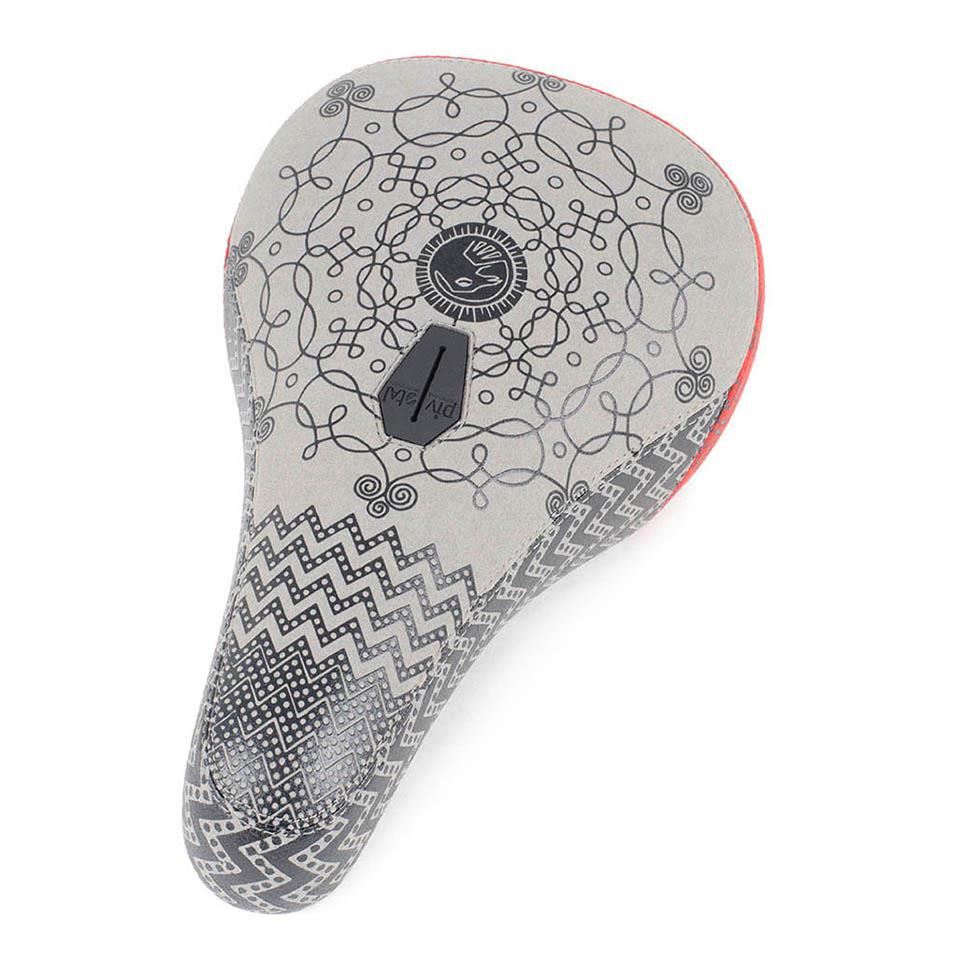 Using a pivotal system for use with all pivotal seat posts the Punumbra Coulomb seat has a durable microfiber material cover with screen pritned patterns and graphics throughout.